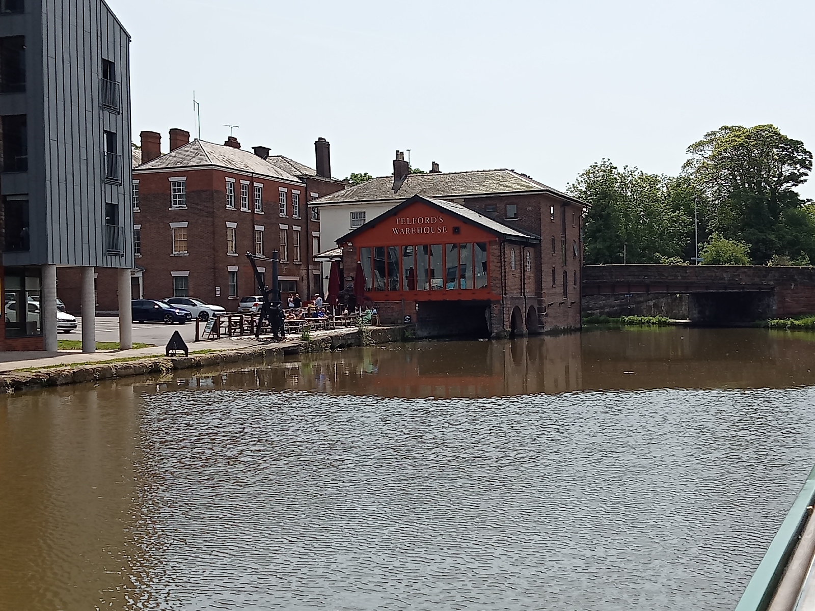 We stopped again just below the locks into Chester to top up with water and attend to the loo. On the other side of the canal is Telford's Warehouse, now a pub.
